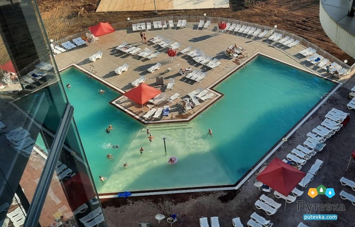 Отдыхали в сентябре 6 ночей, приехали рано утром , заселили только в 14ч, благо сразу надели браслеты и мы могли посидеть в баре у бассейна. Дали номер чистый с ремонтом на 1 этаже -с выходом на бассейн ,были мыльно -рыльные принадлежности ( докладывали каждый день), но полотенец только 2 на человека(для ног и среднее для рук) ,нет большого полотенца для душа и нет пляжных полотенец. Полотенца за 6дней ни разу не поменяли хотя написано что раз в 3дня.Вай-фай ловил в номере и у бассейна. Столовая -шведский стол, но одно и тоже ежедневно, голодным не будешь, но и выбор не очень (свинина, курица, минтай, печень-на этом все) , выпечка тоже без изысков-сухие бисквиты и печенья, нравились только завтраки( омлет, вареники, блинчики, творожная запеканка, творог ,сметана, каши, сыр, колбаса, сл.масло) , кофе правда только растворимый, фрукты -яблоки, груши, сливы, арбузы, видели были персики-но нам не досталось) -разбирали мгновенно . В баре вкусное мороженое ,и на этом все (в баре работники выкладывали еду по тарелкам не прикрывая их ничем -естественно на них садились мухи. Пляж не оборудован от слова совсем-лежат бетонные разваленные плиты и среди них лежаки, зонтов нет вообще Ну и естественно поймали РОТОВИРУС 2дня из 6-провалялись пластом Не понятно что стало причиной- вода в море или столовая В общем отдохнули на троечку.