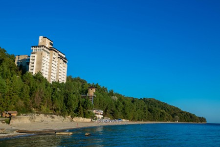 Корпус пансионата утопает в буйной зелени: субтропические леса и сады окружают его плотным кольцом, занимая большую часть территории. Гористая местность и бескрайнее Чёрное море дополняют пейзаж, подтверждая очевидную истину: климат этой рекреационной зоны обладает лечебными свойствами и благоприятен для тех, кто страдает заболеваниями: