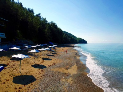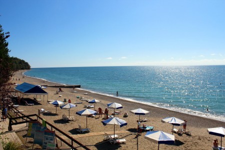 Собственный песчано-галечный пляж продолжительностью 1 км расположен в 50 м от корпуса, добраться туда можно с помощью лифта. Зонты и лежаки выдаются бесплатно под денежный залог.