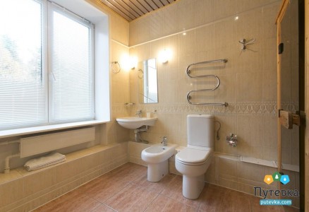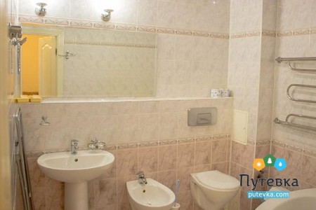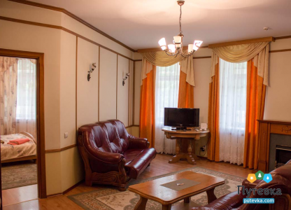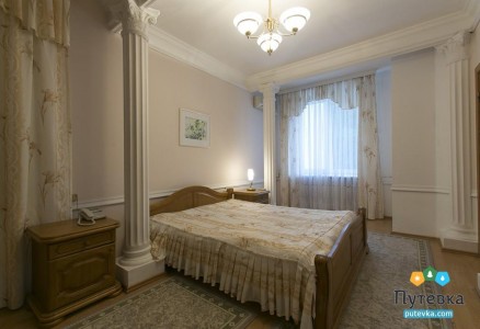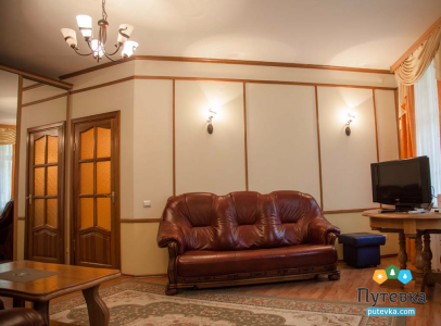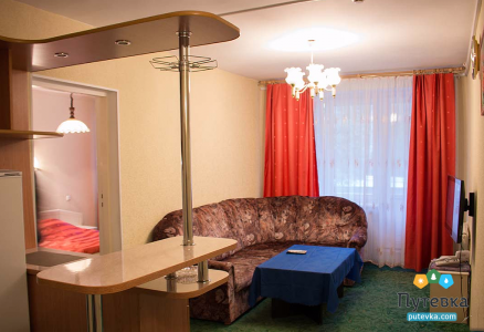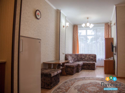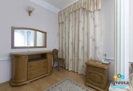 В номере:кровати односпальные, вешалка, диван, зеркало, комод, прикроватные тумбочки, столик кофейный, стулья, шкаф, телевизор ЖК, телефон, холодильник.