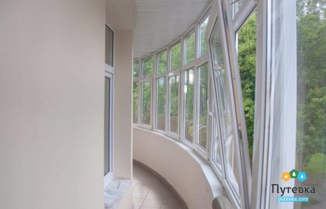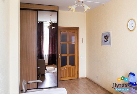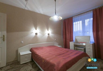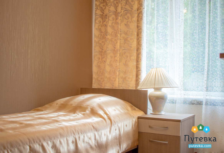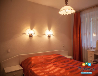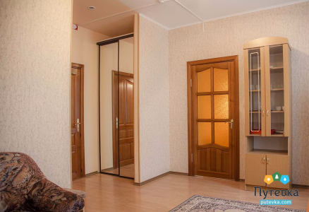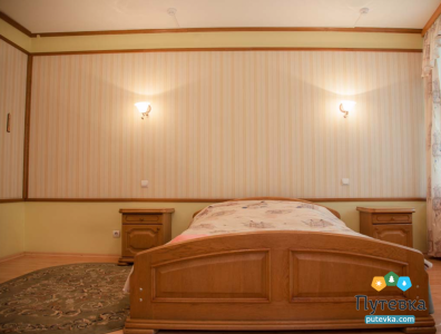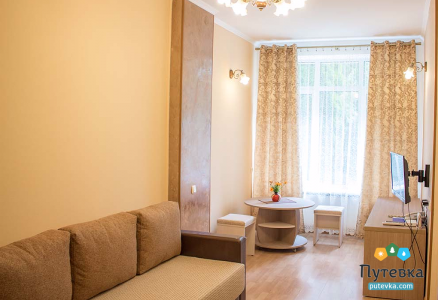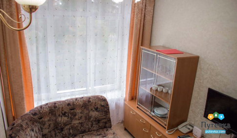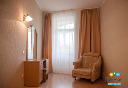 В номере:кровать односпальная, вешалка, диван, зеркало, кресло-кровать, прикроватная тумбочка, столик журнальный, столик туалетный, шкаф, шкаф для посуды, телевизор, телефон, утюг, холодильник, электрочайник, балкон.