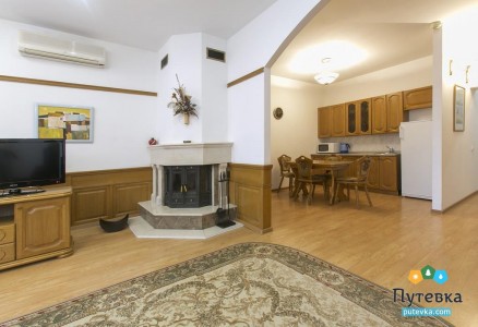 В номере:кровать двуспальная, зеркало, комод, кухонная мебель, набор мягкой мебели, прикроватные тумбочки, столик журнальный, тумба под телевизор, шкаф встроенный, камин, микроволновая печь, кондиционер, телевизор, телефон, холодильник, wi-fi.