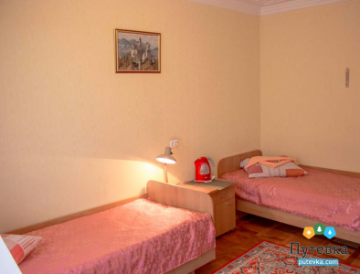 В номере:кровати односпальные, вешалка, зеркало, прикроватные тумбочки, стол, стулья, шкаф, телевизор, телефон, холодильник.