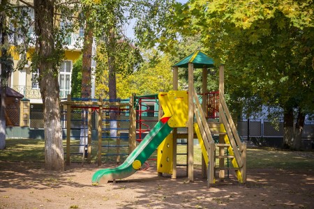 Территория ухоженная, везде дорожки, клумбы, есть подобие детской площадки.