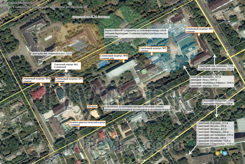 От ж/д вокзала г. Ессентуки — 1 км: маршрутным такси до санатория.