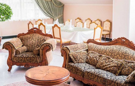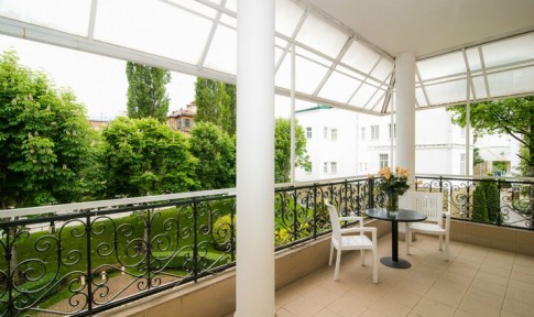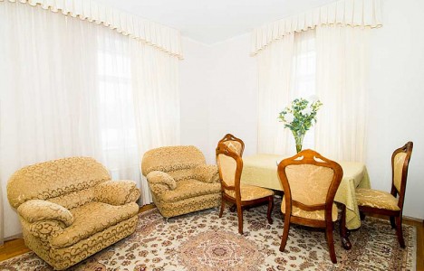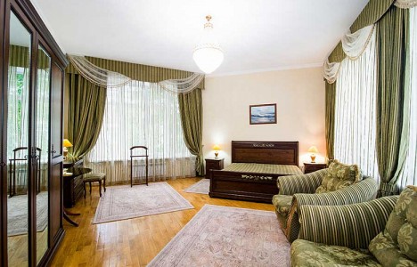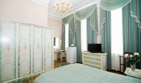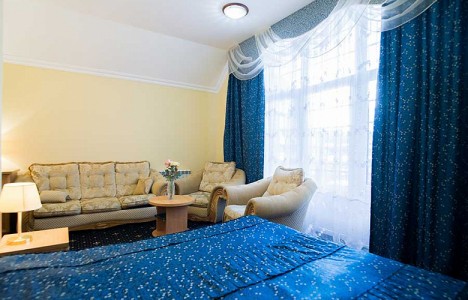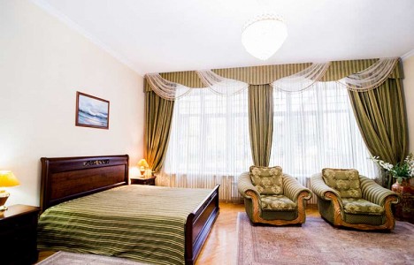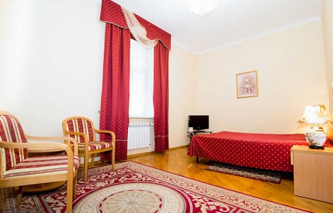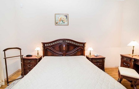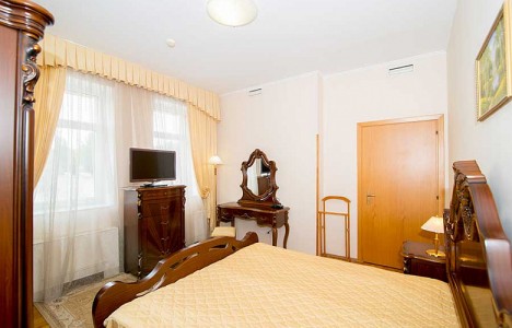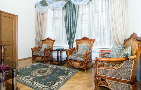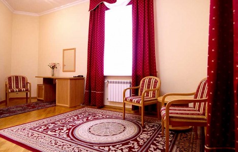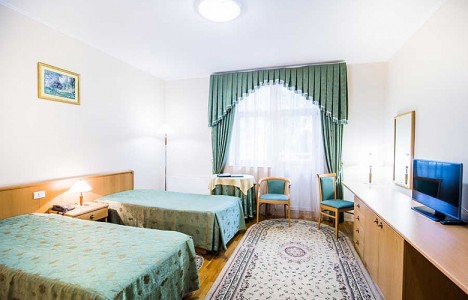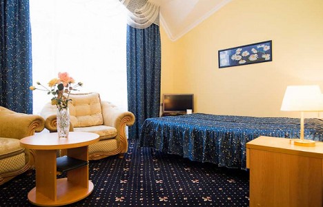 В номере:двуспальная или две односпальные кровати, прикроватные тумбочки, набор мягкой мебели, журнальный столик, стол, стулья, шкаф, кондиционер, электрочайник, набор посуды, утюг, гладильная доска, балкон.