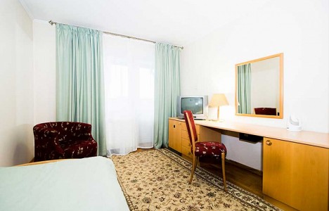 В номере:вешалка, зеркало, кровать односпальная, прикроватные тумбочки, стол, стулья, шкаф, балкон, кондиционер, телевизор, чайный набор посуды, электрочайник.