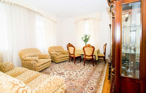 В номере:вешалка, кровать двуспальная, набор мягкой мебели: (диван и кресла), прикроватные тумбочки, столик журнальный, столик туалетный, стулья, шкаф, шкаф для посуды, гладильная доска, кондиционер, набор посуды, сейф, телевизор, телефон, утюг, холодильник, электрочайник.