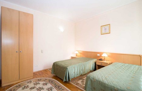 В номере:двуспальная или две односпальные кровати, прикроватные тумбочки, журнальный столик, стол, стулья, шкаф, кондиционер, электрочайник, набор посуды, балкон.