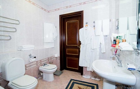- биде, душ, тапочки, туалетные принадлежности, фен, халат, туалет, умывальник.