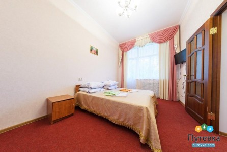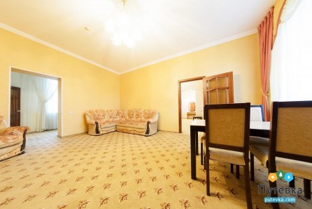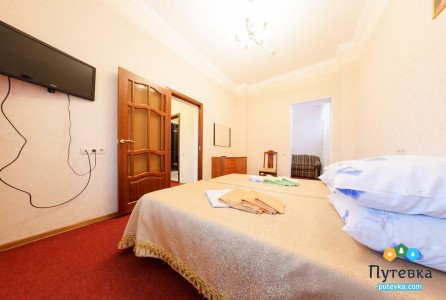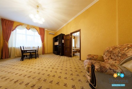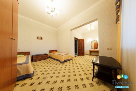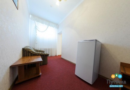 В номере:две односпальные кровать или одна двуспальная, набор мягкой мебели, прикроватные тумбочки, стулья, шкаф, шкаф для посуды, телевизор, холодильник.