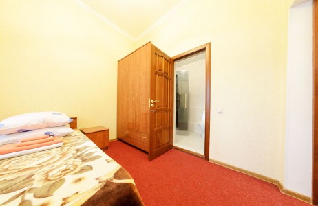 В номере:односпальная кровать, набор мягкой мебели, прикроватные тумбочки, стулья, шкаф, шкаф для посуды, телевизор, холодильник.