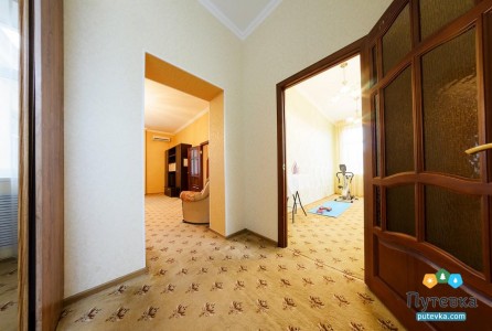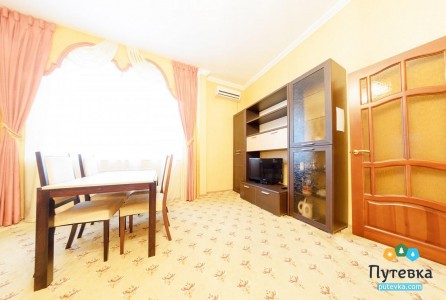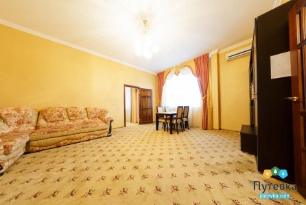 В номере:две спальные комнаты, гостиная, прихожая, полностью оборудованный санузел, кровати (2+2), бытовая техника (холодильник, ТВ, кондиционер).