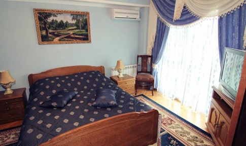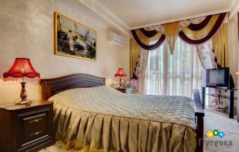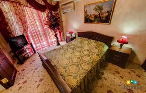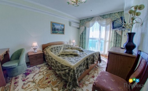 В номере:кровать двуспальная, прикроватные тумбочки, журнальный столик, стулья, шкаф, телевизор, холодильник, кондиционер, балкон.