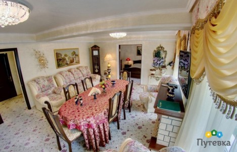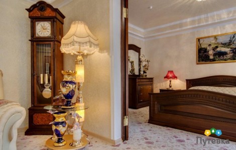 В номере:двуспальная кровать, прикроватные тумбочки, набор мягкой мебели, журнальный столик, туалетный столик, стулья, комод, шкаф, телевизор, кондиционер, балкон, холодильник.
