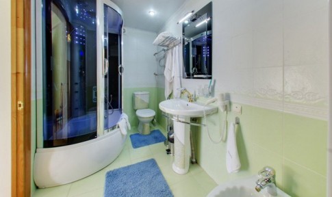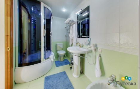 - душ, джакузи, туалет, умывальник, фен, туалетные принадлежности, халаты, тапочки.