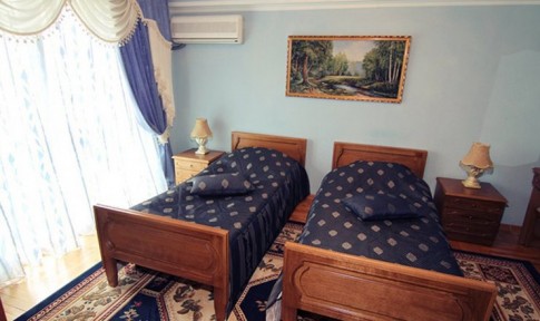 В номере:две односпальные кровати, прикроватные тумбочки, туалетный столик, телевизор, холодильник, шкаф, балкон.