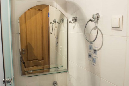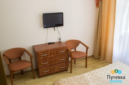 В номере:полутороспальная кровать, телевизор, холодильник, электрочайник, телефон, кондиционер, сейф.