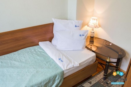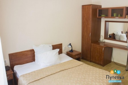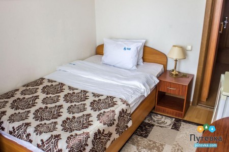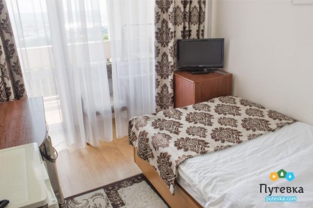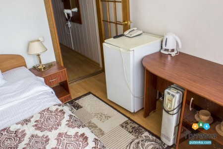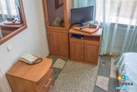 В номере:полутороспальная кровать, телевизор, холодильник, телефон.