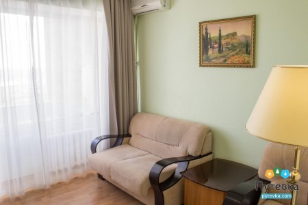 В номере:кондиционер, полутороспальная кровать, шкаф, тумбочки, балкон, телевизор.