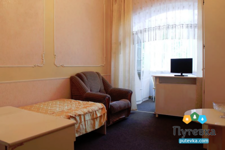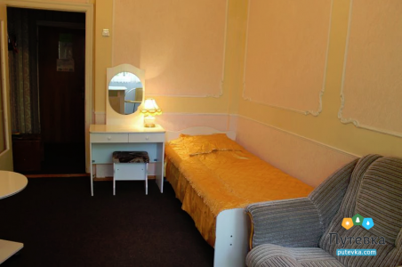 В номере:односпальная кровать, прикроватная тумбочка, туалетный столик, стул, телевизор, холодильник.
