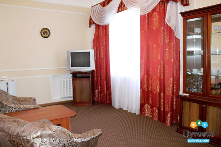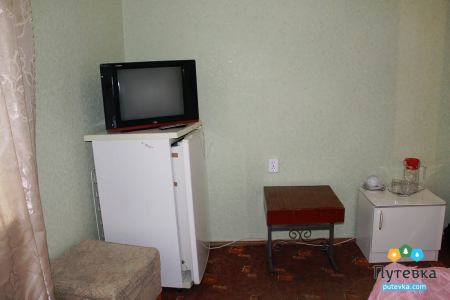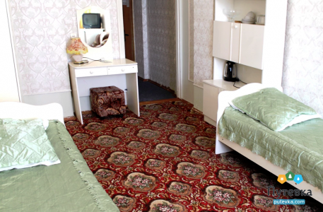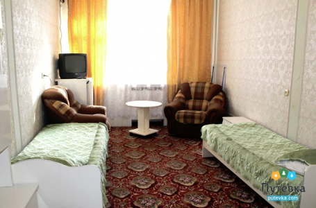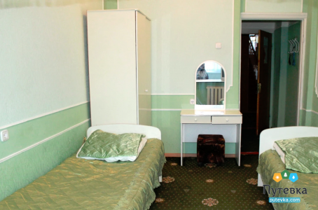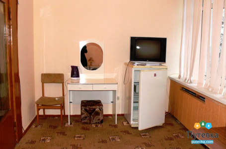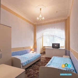 В номере:телевизор, две односпальные кровати, мини-холодильник, электрический чайник, шкаф, рабочий стол, туалетный столик.