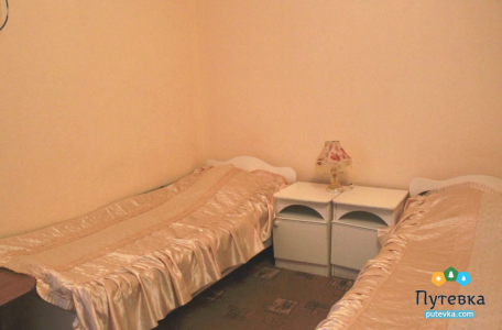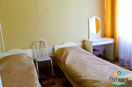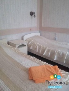 В номере:две односпальные кровати, прикроватные тумбочки, столик туалетный, стул, шкаф, телевизор, холодильник, электрочайник, набор посуды, шкаф.