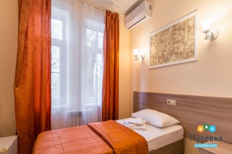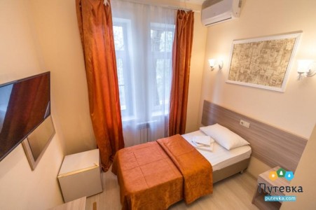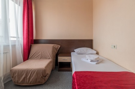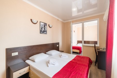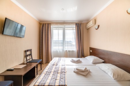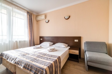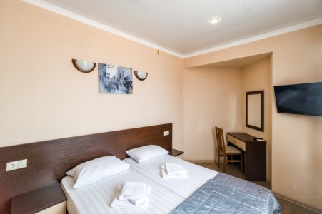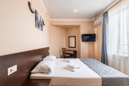 В номере:кровати односпальные, вешалка, диван, зеркало, прикроватные тумбочки, стол, стулья, шкаф, мини-холодильник, сплит-система, телевизор.
