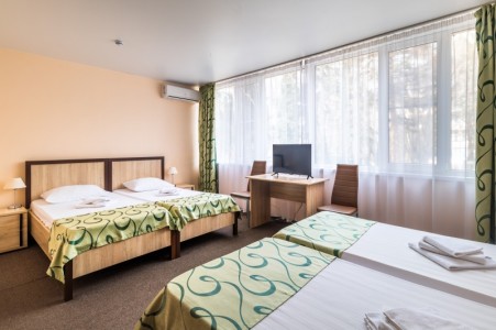 В номере:четыре односпальные кровати, прикроватные тумбочки, стол, стулья, шкаф, сплит-система, телевизор, холодильник.
