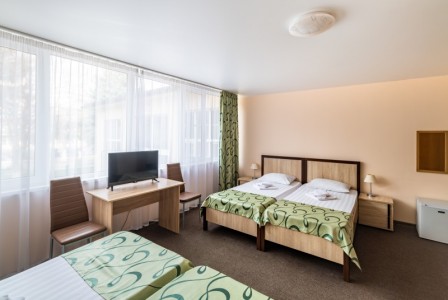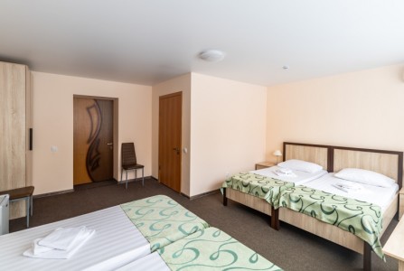 В номере:кровати односпальные: или одна двуспальная кровать и одна односпальная кровать, вешалка, зеркало, прикроватные тумбочки, стол, стулья, шкаф, сплит-система, телевизор, холодильник.
