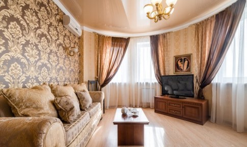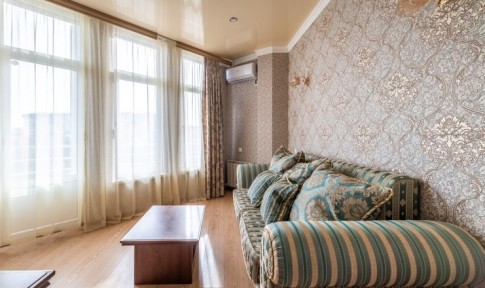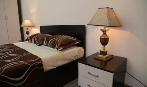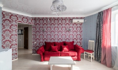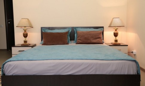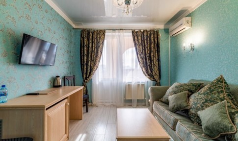 В номере:двуспальная кровать, прикроватные тумбочки, раскладной диван, стол, стул, шкаф, сплит-система, телевизор, холодильник, микроволновая печь, электрочайник, чайный набор посуды.