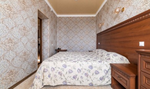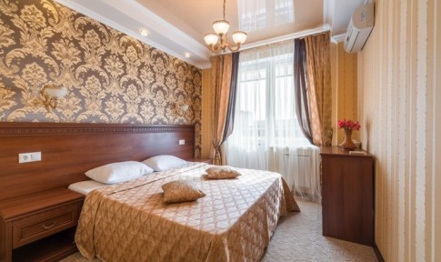 В номере:кровать двуспальная, вешалка, диван, зеркало, комод, прикроватные тумбочки, стол, стулья, шкаф, сплит-система, телевизор, холодильник, балкон.