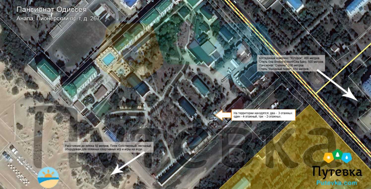 Пансионат расположен в Анапе, по адресу Россия, Краснодарский край, г. Анапа, Пионерский пр-т, д. 267.