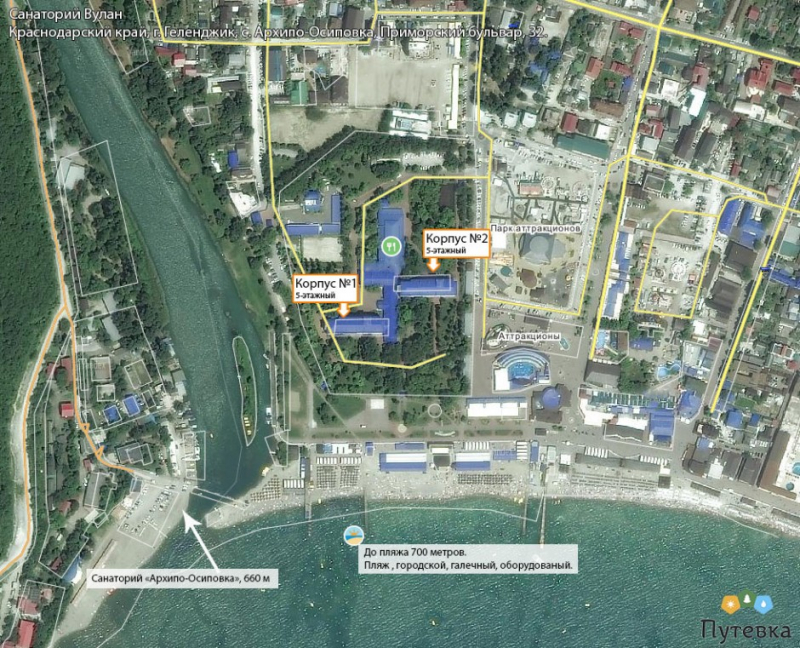 - До пляжа: 150 метров от корпусов №1, 2. Корпуса №4, 5 находятся на пляже.