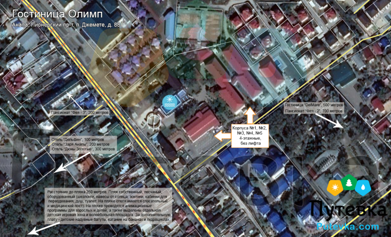 - До пляжа: 150 метров от корпусов №1, 2. Корпуса №4, 5 находятся на пляже.