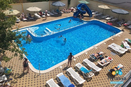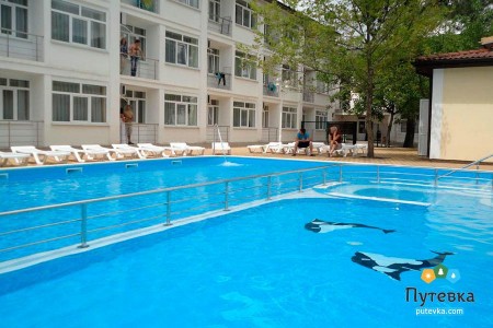 Видно море и из окон 2-го корпуса пансионата. Оба жилых здания – 3-этажные. Во дворе – просторный пресноводный бассейн размером 20х10 м с мелководной детской зоной на подогреве. Посещение его входит в стоимость путевки. Жилой фонд – 79 номеров категории Стандарт и Комфорт с 1-2 комнатами на 1-3 гостей. Все они – с отдельными санузлами, нужно уточнять, есть ли балкон и дополнительное место. Повсеместно имеется кондиционер, ТВ, мини-холодильник, в наличии – посуда для чаепития, кое-где – сейф. Мебель везде новая, удобная, помещения светлые, обставлены со вкусом.