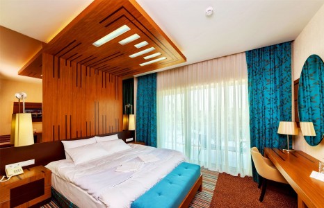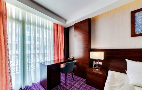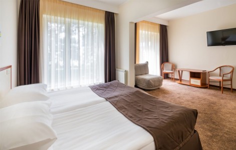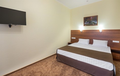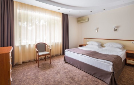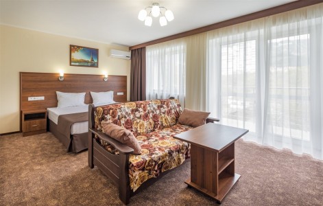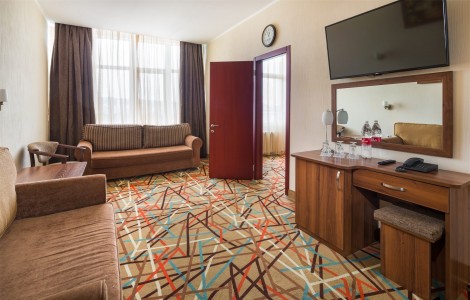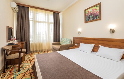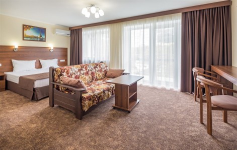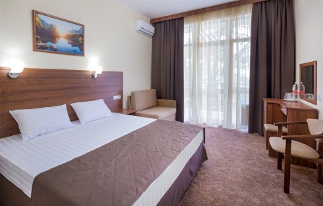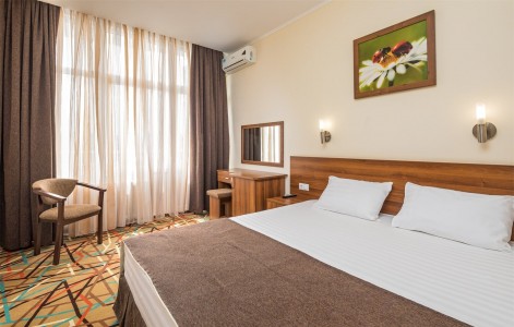 В номере:кровати односпальные или одна двуспальная кровать, вешалка, зеркало, ковровое покрытие, прикроватные тумбочки, стол, стулья, шкаф, мини-холодильник, сейф, сплит-система, телевизор, телефон, балкон с мебелью.