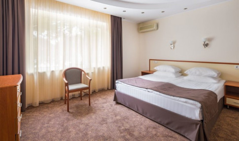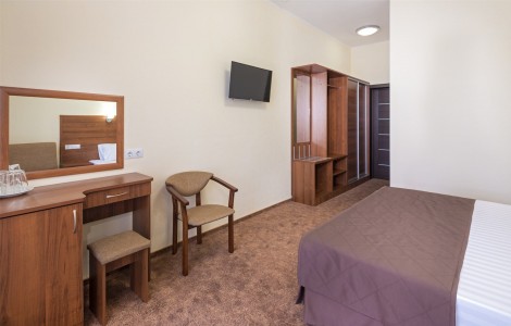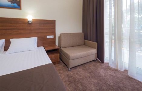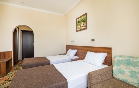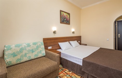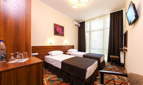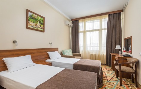 В номере:двуспальная или две односпальные кровати, прикроватные тумбочки, раскладное кресло, столик туалетный, стулья, шкаф, телевизор, холодильник, кондиционер, балкон.