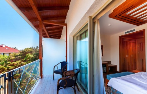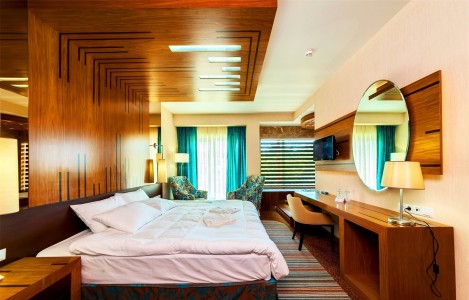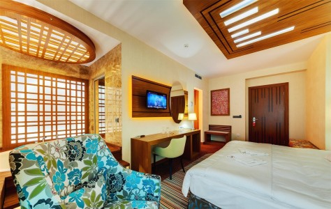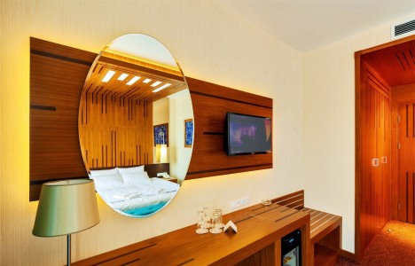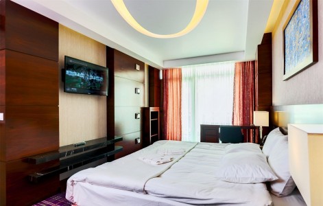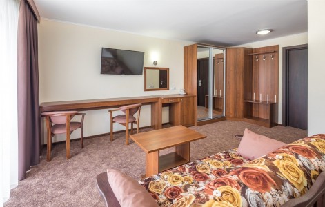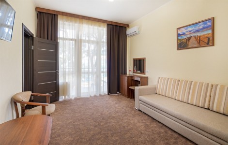 В номере:двуспальная или две односпальные кровати, прикроватные тумбочки, набор мягкой мебели, столик туалетный, столик журнальный, стол, стулья, шкаф, телевизор, холодильник, кондиционер, балкон.