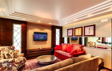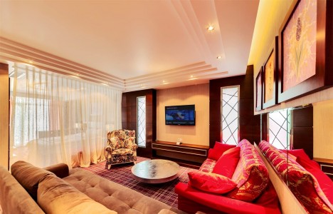 В номере:двуспальная кровать, диван, прикроватные тумбочки, набор мягкой мебели, гардероб, столик туалетный, столик журнальный, стол, стулья, шкаф, телевизор, холодильник, сейф, кондиционер, балкон.