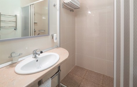 - душ, туалет, умывальник, тапочки, туалетные принадлежности, фен, халат.