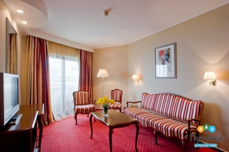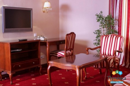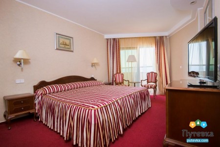 В номере:кровать двуспальная, вешалка, диван, зеркало, прикроватные тумбочки, стол, столик туалетный, стулья, шкаф, кондиционер, набор посуды, сейф, телевизор ЖК, телефон, электрочайник, балкон (не во всех номерах).