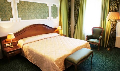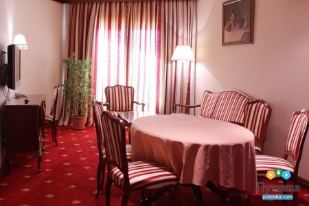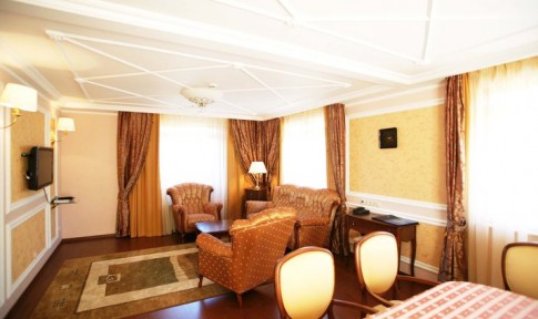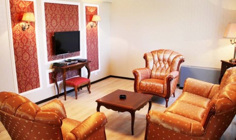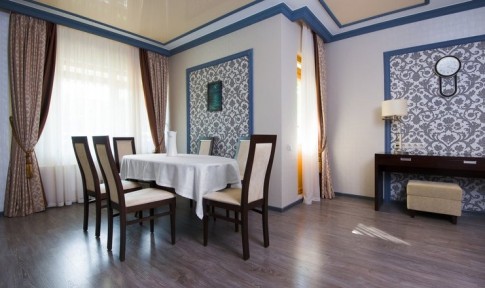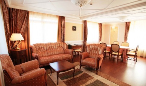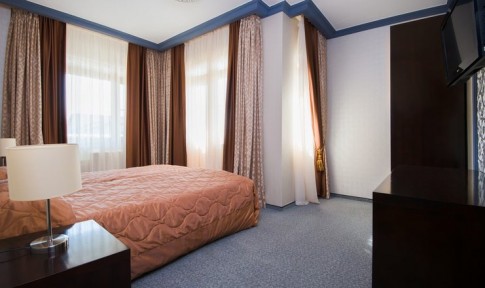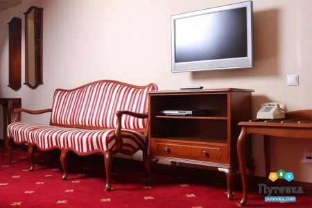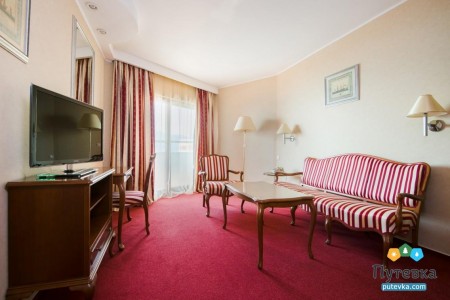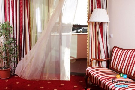 В номере:кровать двуспальная, вешалка, диван, зеркало, ковровое покрытие, комод, кресла, кухонная мебель, прикроватные тумбочки, стол, столик журнальный, столик туалетный, стулья, шкаф, мини-кухня, набор посуды, сейф, сплит-система, телевизор ЖК, телефон, холодильник, чайный набор посуды, электрочайник, балкон или терраса.