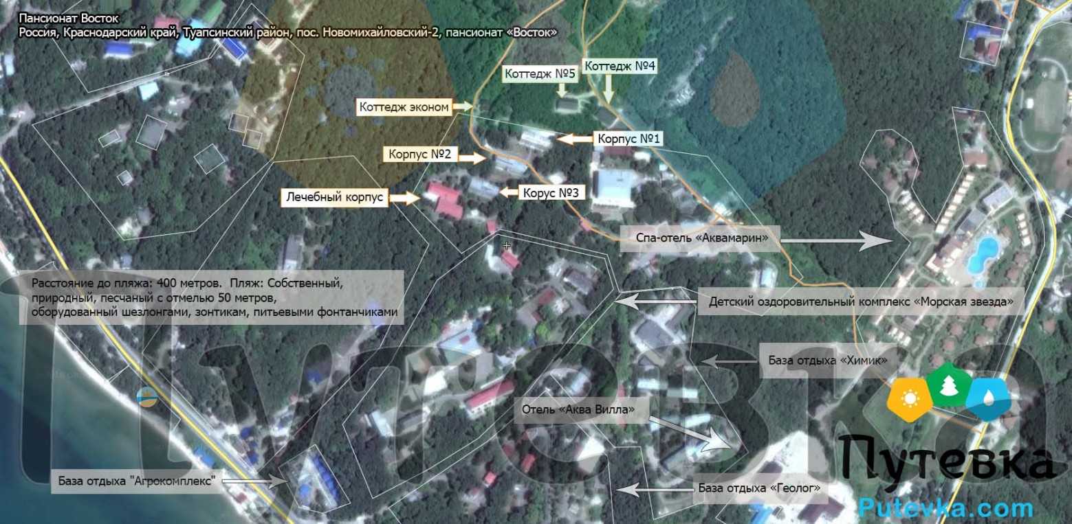 Пансионат расположен в Новомихайловском, по адресу Россия, Краснодарский край, Туапсинский район, пос. Новомихайловский-2, пансионат «Восток».