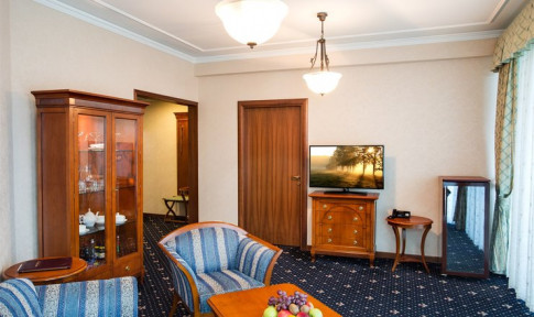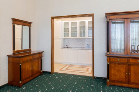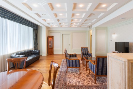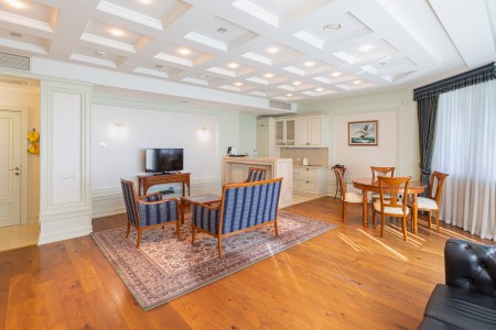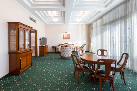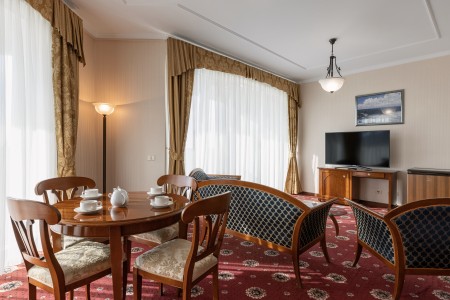 В номере:кровать двуспальная, набор мягкой мебели, прикроватные тумбочки, стол, столик журнальный, стулья, тумба под телевизор, набор посуды, сейф, система общего кондиционирования, телевизор, телефон, холодильник.