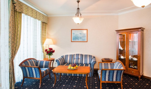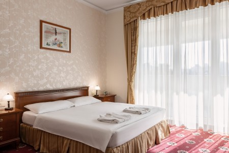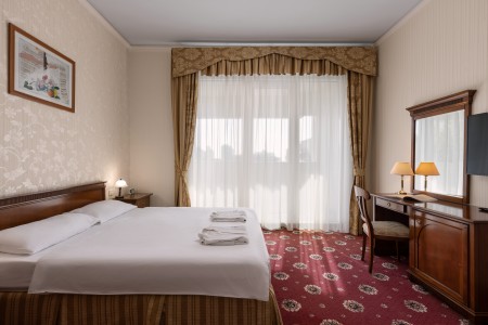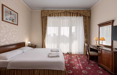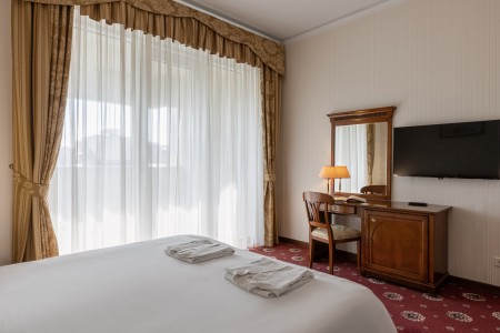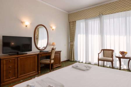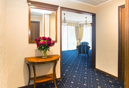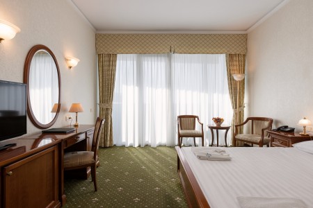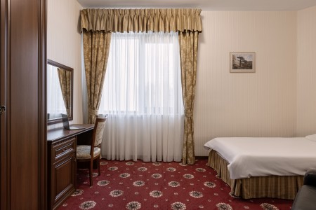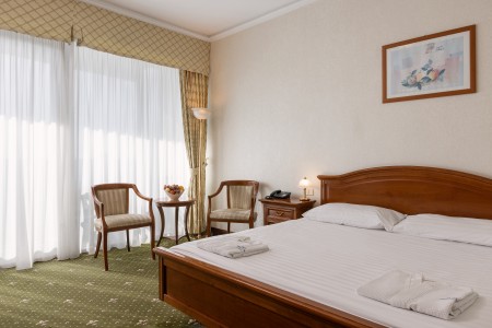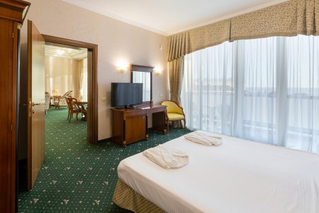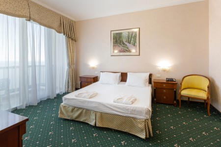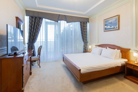 В номере:кровать двуспальная или две полутороспальные кровати, вешалка, зеркало, набор мягкой мебели, прикроватные тумбочки, стол, стулья, шкаф, набор посуды, сейф, система общего кондиционирования, телевизор, телефон, холодильник, балкон с мебелью.