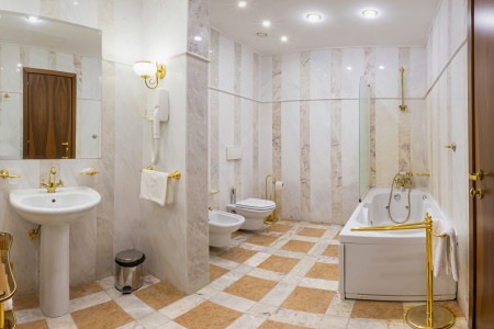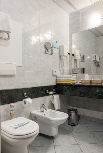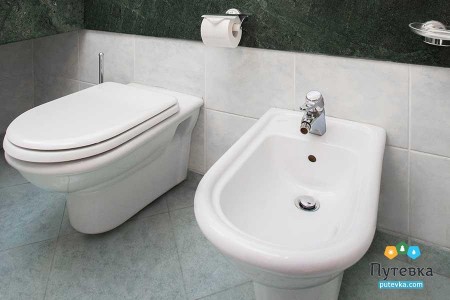 - биде, ванна или душ, тапочки, туалетные принадлежности, фен, халат, туалет, умывальник.
