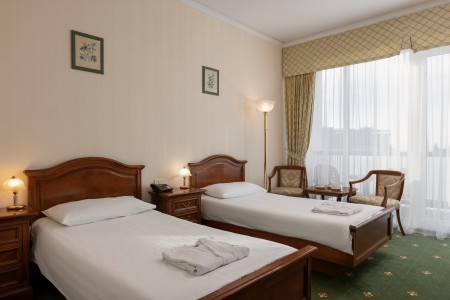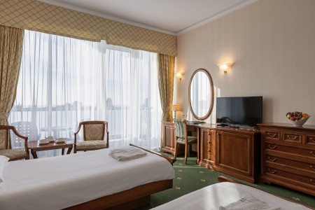 В номере:две односпальные кровати, вешалка, диван, зеркало, прикроватные тумбочки, стол, стул, шкаф, набор посуды, сейф, система общего кондиционирования, телевизор, телефон, холодильник, балкон с мебелью.