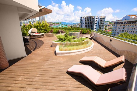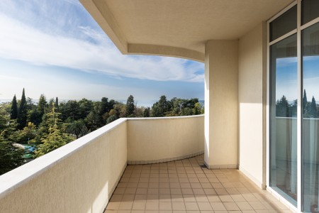 В номере:кровать двуспальная, диван, зеркало, кухонная мебель, набор мягкой мебели, прикроватные тумбочки, стол, столик журнальный, столик туалетный, стулья, тумба под телевизор, шкаф, шкаф для посуды, набор посуды, сейф, система общего кондиционирования, телевизор, телефон, холодильник, кухня, балкон с мебелью.