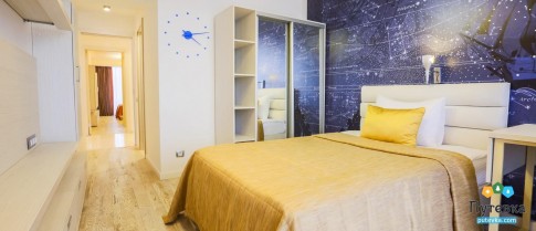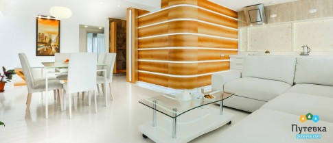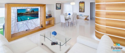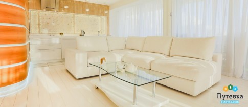 В номере:двуспальная кровать, мягкий уголок, кондиционер, 2 гардеробные комнаты с сейфом, холодильник, 2 телевизора, телефон, 2 круговых балкона, мини-кухня, Wi-Fi, балкон.
